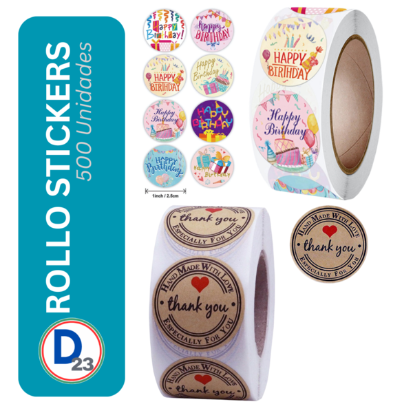 STICKERS 2,5 CMS ROLLO 500 UNIDADES (CUMPLE/THANK YOU)